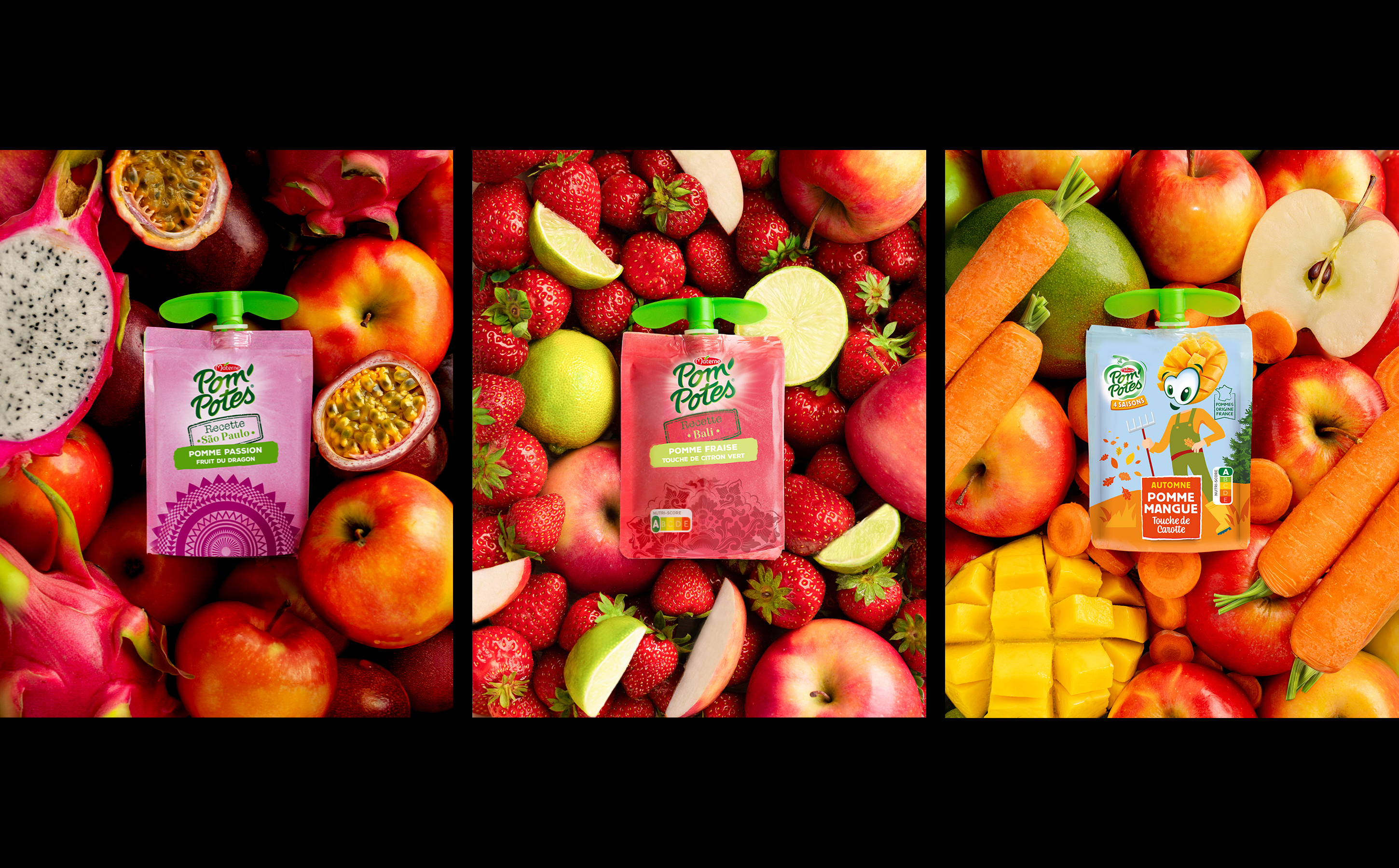 Materne adopte une esthétique élégante et épurée : fonds monochromes, codes couleurs par recette, compositions en équilibre évoquant maîtrise et précision.Pom’Potes mise sur l’énergie et la générosité : flat lays immersifs, fonds recouverts de fruits, explosion de couleurs fidèles aux packagings.