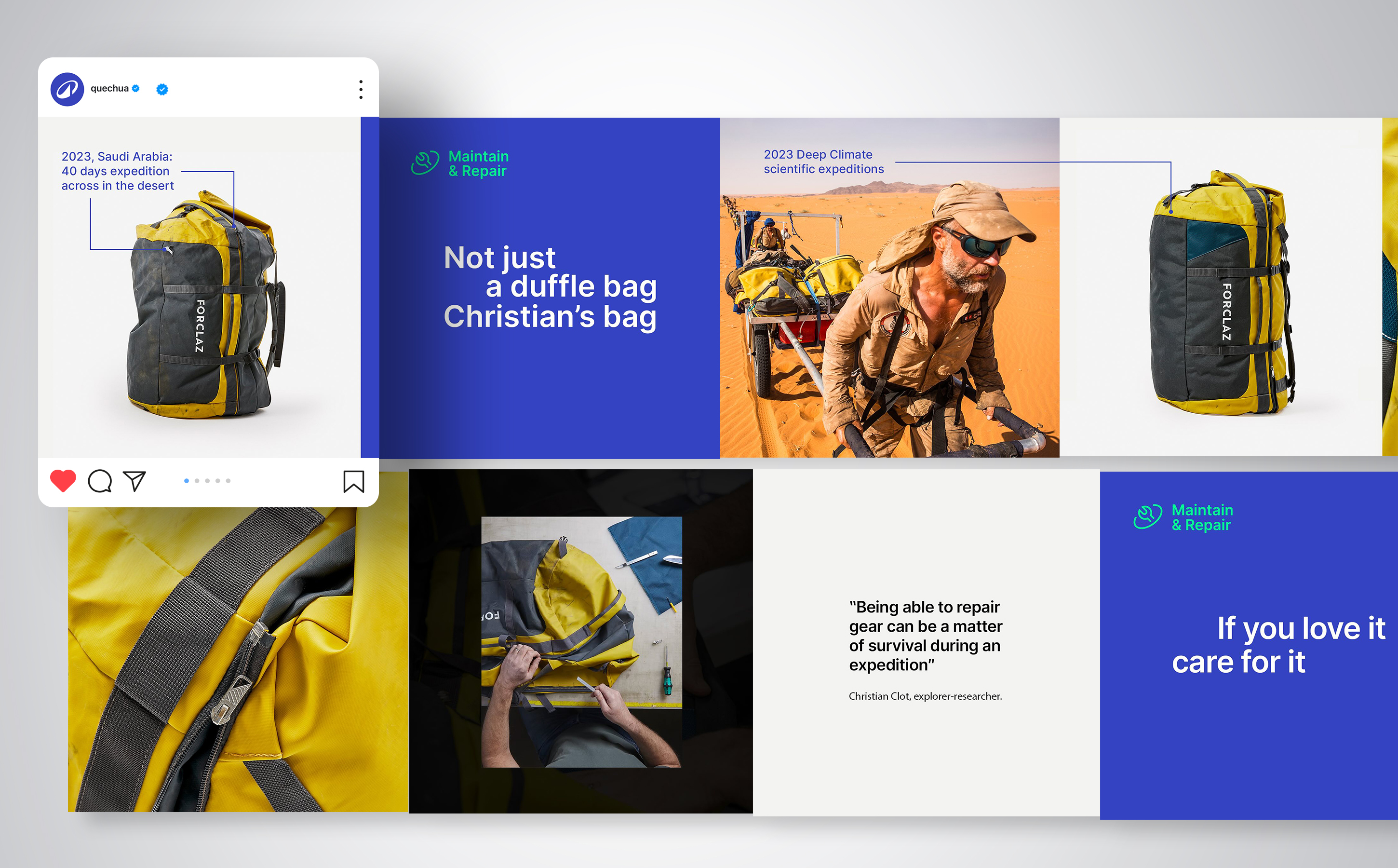 Cette campagne célèbre les traces laissées par le temps : une déchirure, une brûlure, une couture qui lâche… ne sont pas des défauts. Ce sont des souvenirs. Grâce aux patchs de réparation Quechua, on peut continuer d’utiliser ces objets longtemps, sans devoir s’en séparer.